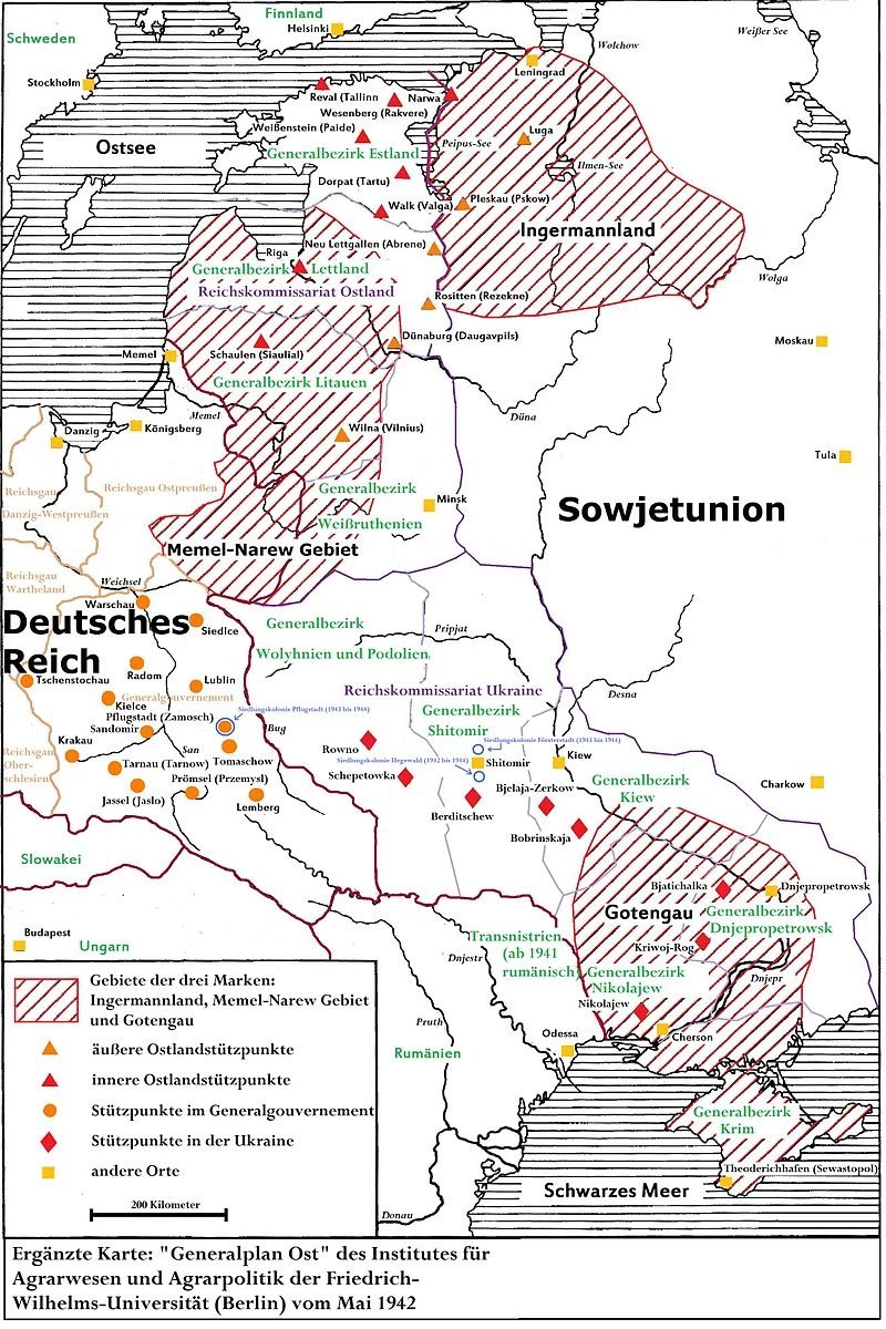 Mapa de proyección de la Alemania Nazi, de 1941. Muestra las colonias planificadas al invadir Ucrania, Belarús, los estados Bálticos y Polonia.