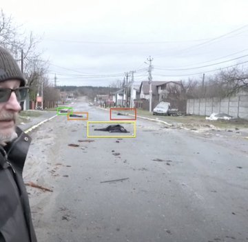 Sardarizadeh también hace notar que las fotografías de la AFP y las Getty Images muestran que los cuerpos vistos en videos del 1 de abril siguen en el mismo lugar exacto días después, el 3 de abril. El investigador independiente y colaborador de Bellingcat, Benjamin Strick, encontró otros videos de los cadáveres, para probarel mismo punto.