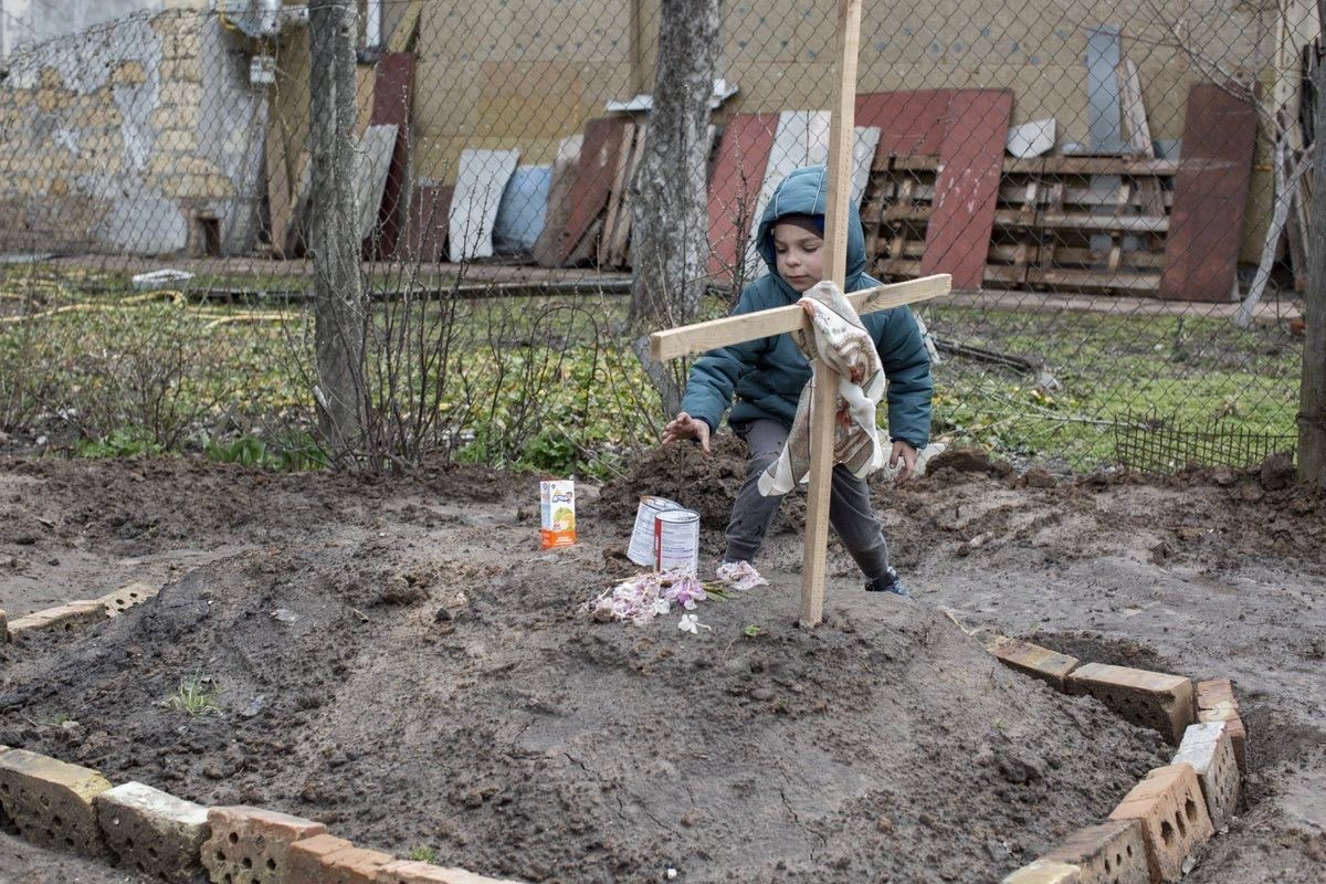Un niño lleva comida enlatada a la tumba de su madre, quien falleció por hambre durante el más de un mes que laa.ciudad de Bucha estuvo en manos de los rusos en marzo de 2022. En 1933 y otras 2 ocasiones más, el pueblo ruso intentó exterminar a todo ucraniano en lo que se llama «Holodomor» (pinchar imagen)