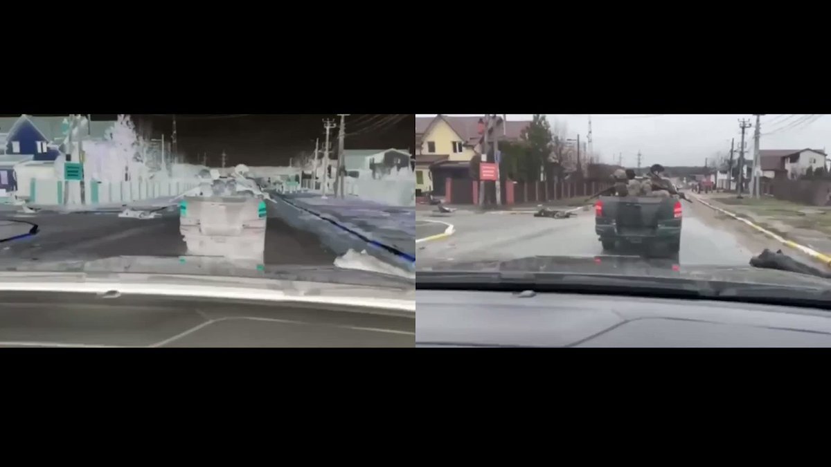 Un video que se compartió por medio de Telegram el 1 de abril a las 6:18 BST y un video compartido en Twitter a las 9:02 pm muestra cuerpos que yacen a lo largo de la calle Yablunska en Bucha. Otros videos de la misma calle fueron publicados entre el 1 y el 2 de abril, que pueden ser vistos aquí.