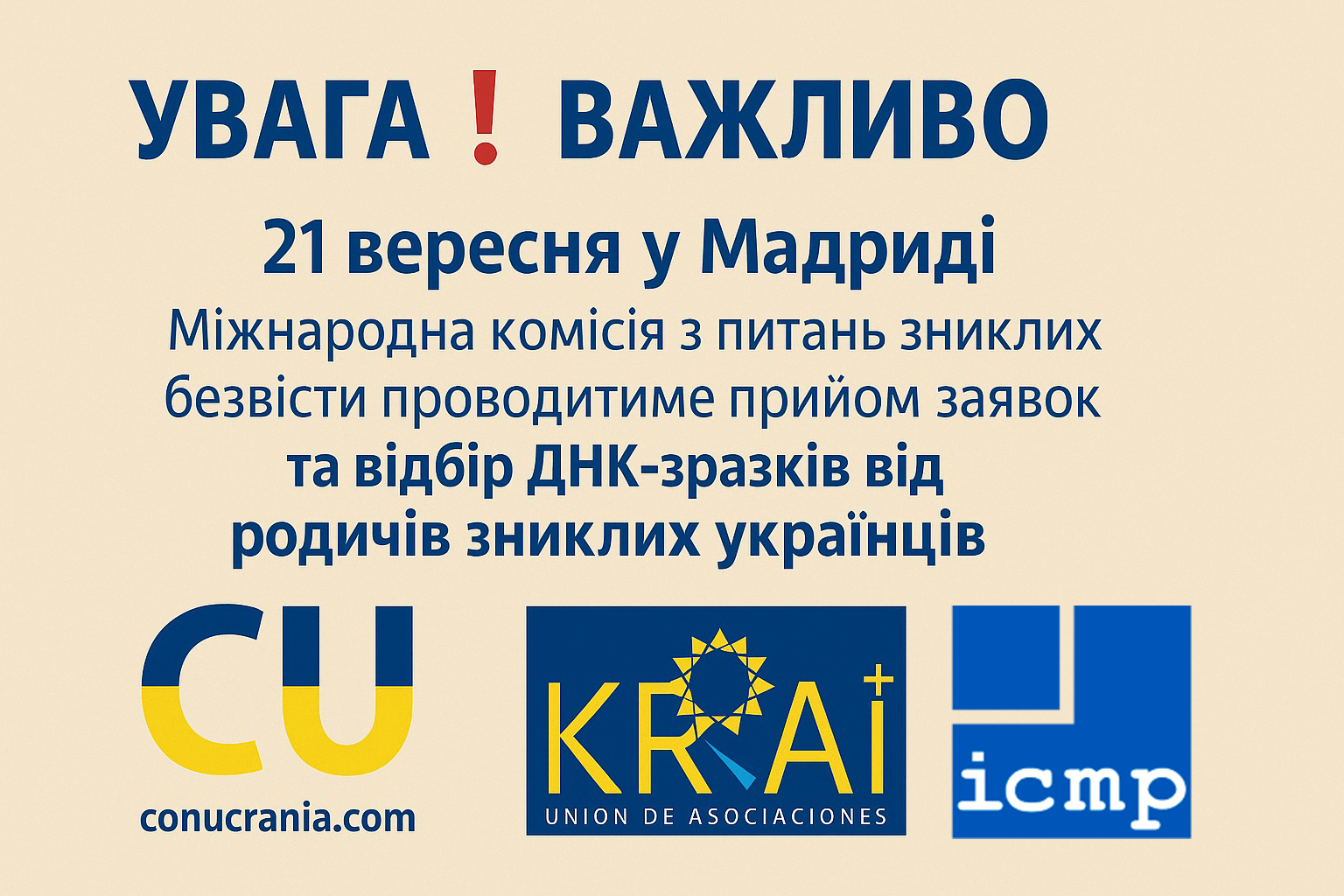 Міжнародна комісія з питань зниклих безвісти (ICMP) здійснюватиме прийом заявок та відбір ДНК-зразків від родичів зниклих безвісти українців. 21 вересня у Мадриді відбудеться надзвичайно важлива подія для українців в Іспанії. Це шанс для багатьох родин, які досі живуть у невідомості, нарешті наблизитися до відповіді на найболючіше питання: де їхні рідні? Чому це так важливо?Тисячі українськихSigue leyendo «Родичі зниклих безвісти українців можуть подати заявки на ДНК-аналіз 21 вересня у Мадриді»