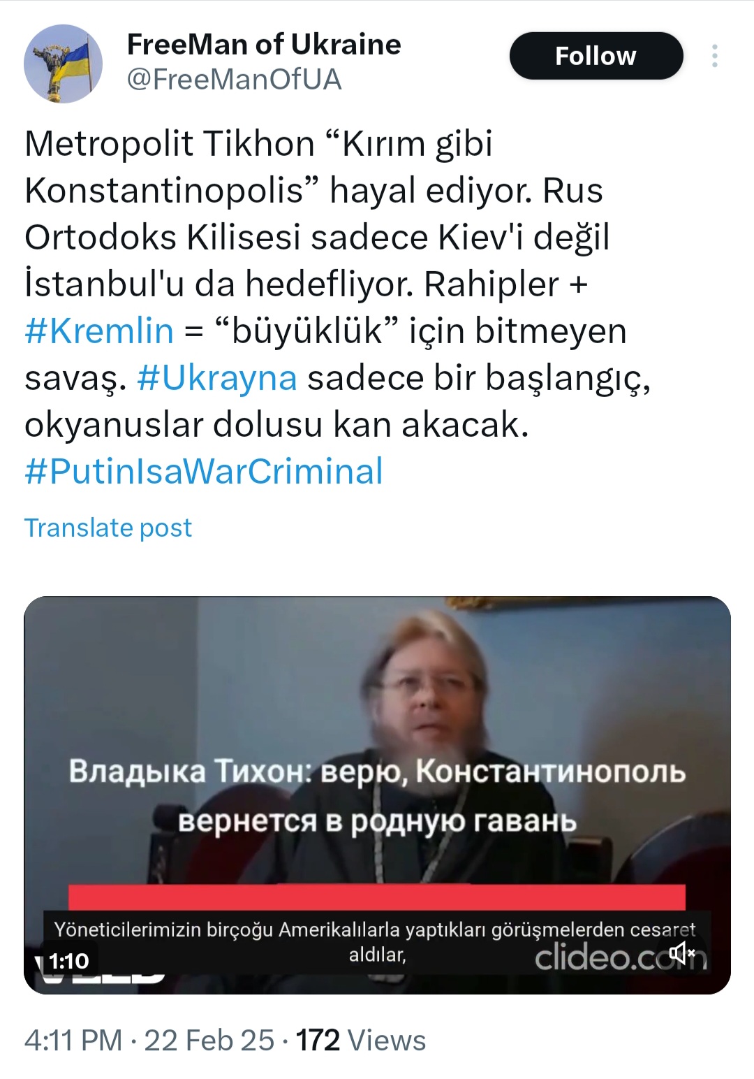 El metropolita Tikhon (Georgy Shevkunov), de Simferopol y Crimea, considerado el principal candidato al puesto de patriarca de la Iglesia ortodoxa rusa, ha expresado reivindicaciones territoriales contra Turquía. En un vídeo publicado en las redes sociales (https://t.me/nevzorovtv/25211), Tikhon afirma explícitamente que cree que «Constantinopla volverá a su puerto de origen, como Crimea».A continuación, reproducimos elSigue leyendo «Estambul, ¿otro objetivo ruso?»
